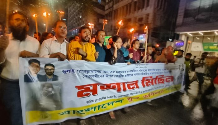 জুলাই গণঅভ্যুত্থানের নায়ক ও গণঅধিকার পরিষদের সভাপতি ডাকসুর সাবেক ভিপি নুরুলহক নুর-সহ নেতাকর্মীদের উপর কেন্দ্রীয় কার্যালয়ের সামনে বর্বরোচিত হামলায় জড়িতদের বিচারের দাবিতে মশাল মিছিল করেছে বাংলাদেশ যুব অধিকার পরিষদ। আজ সোমবার সন্ধ্যা ৭টায় দলীয় কার্যালয়ের সামনে থেকে মশাল মিছিল শুরু করে পল্টন মোড় ঘুরে কার্যালয়ের সামনে এসে শেষ হয়। গণঅধিকার পরিষদের মুখপাত্র ফারুক হাসান বলেন, … Continue reading নুরের হামলাকারীদের বিচার না হলে কঠোর কর্মসূচি গণঅধিকার পরিষদের